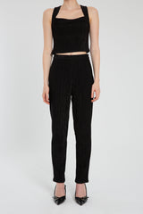 PANTALÓN SASTRERO CONFECCIONADO EN TELA DE PUNTO CON LUREX. SE ACCEDE A LA PRENDA A PARTIR DE UN CIERRE INVISIBLE EN EL LATERAL IZQUIERDO. TIENE CALCE REGULAR CON BOTAMANGA ANGOSTA.