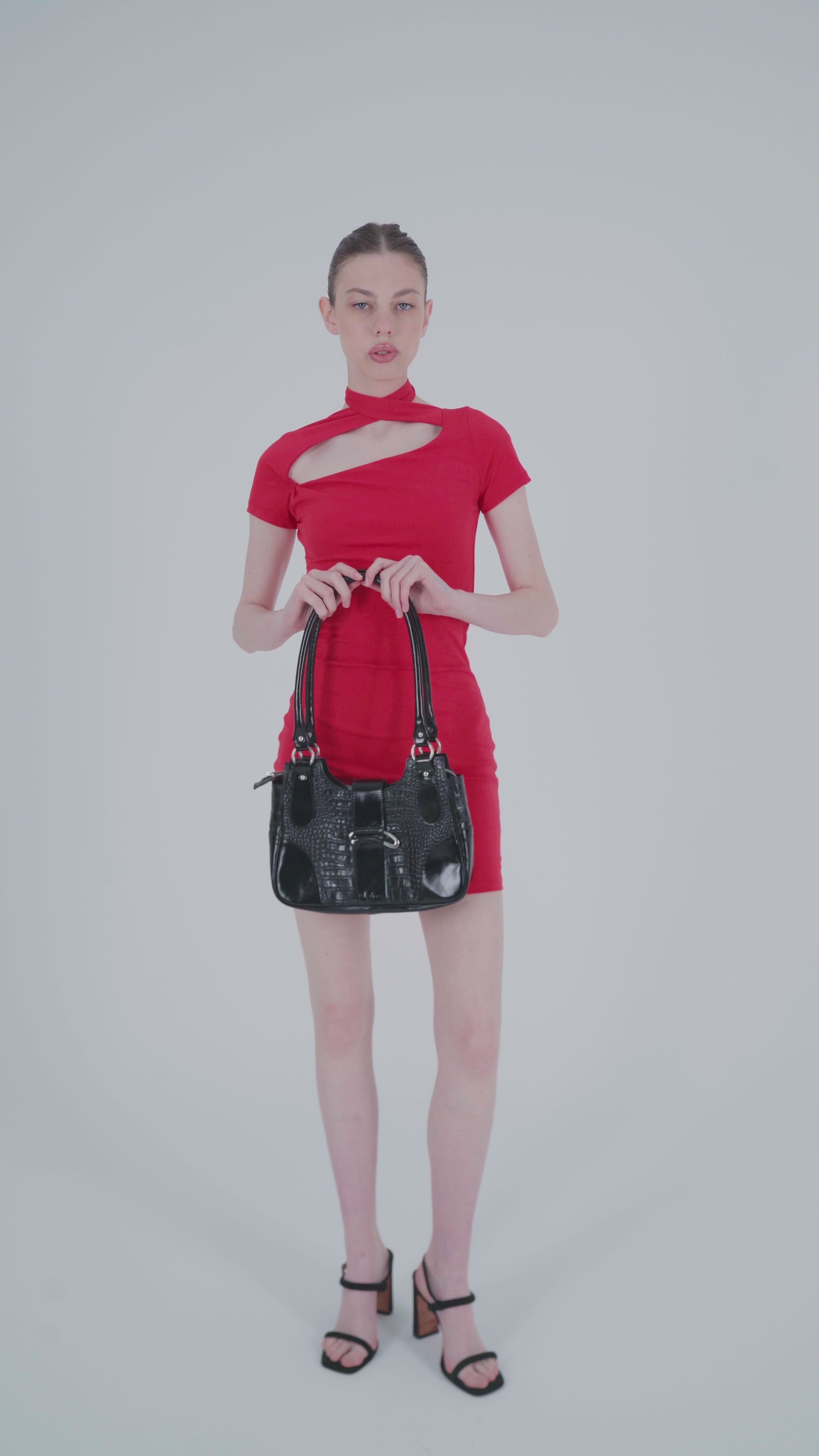 Vestido confeccionado en tela de punto. Posee escote con cuello cruzado y detalle de nudo en la sisa.